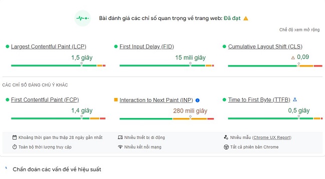 - Dữ liệu người dùng thật (Field Data): Tổng hợp từ lịch sử truy cập của khách hàng thực tế trong 28 ngày qua.