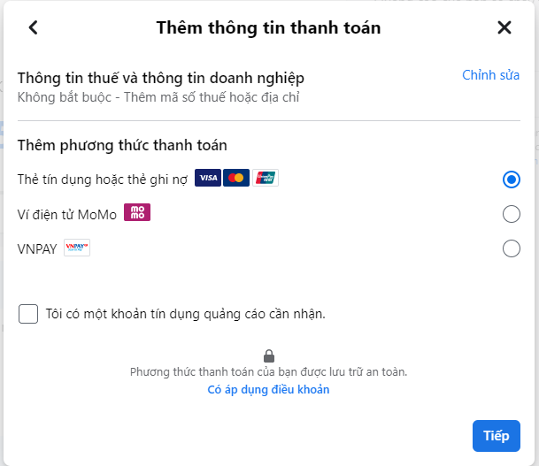 5. Phương thức thanh toán: Hiện tại Facebook có 3 phương thức thanh toán cho bạn lựa chọn. Tuy nhiên, phổ biến thì các nhà quảng cáo chọn Thẻ tín dụng hoặc thẻ ghi nợ