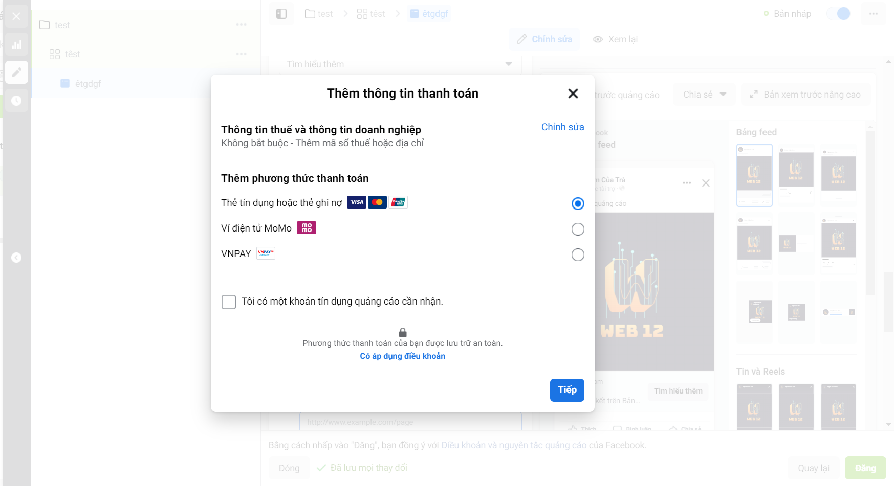 Sau khi setup xong quảng cáo của bạn, nhấn Đăng -> lúc này Facebook sẽ yêu cầu bạn lựa chon phương thức thanh toán và điền thông tin thanh toán.