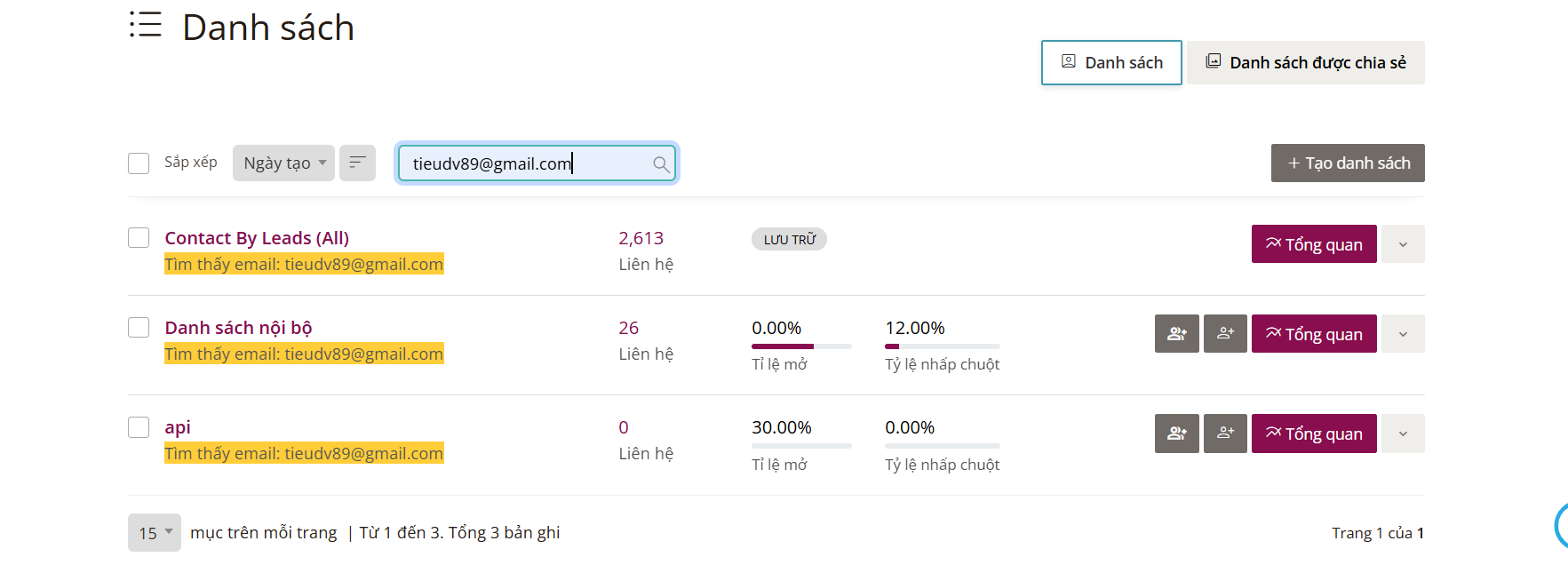 Cách sử dụng rất đơn giản, bạn chỉ cần search email trên ô tìm kiếm sẽ trả về kết quả email đó hiện đang ở trong những danh sách email nào.